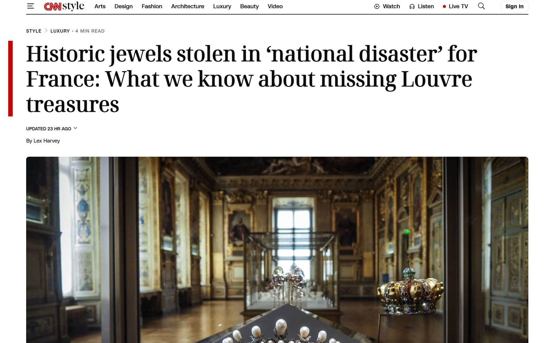 «Целью воров стала Галерея Аполлона на втором этаже, где хранятся сокровища французской короны, — пишет CNN. — Как сообщает Министерство культуры Франции, за семь минут они проворно вскрыли две особо охраняемые витрины и похитили девять предметов. По данным полиции, воры уехали на мотоциклах».