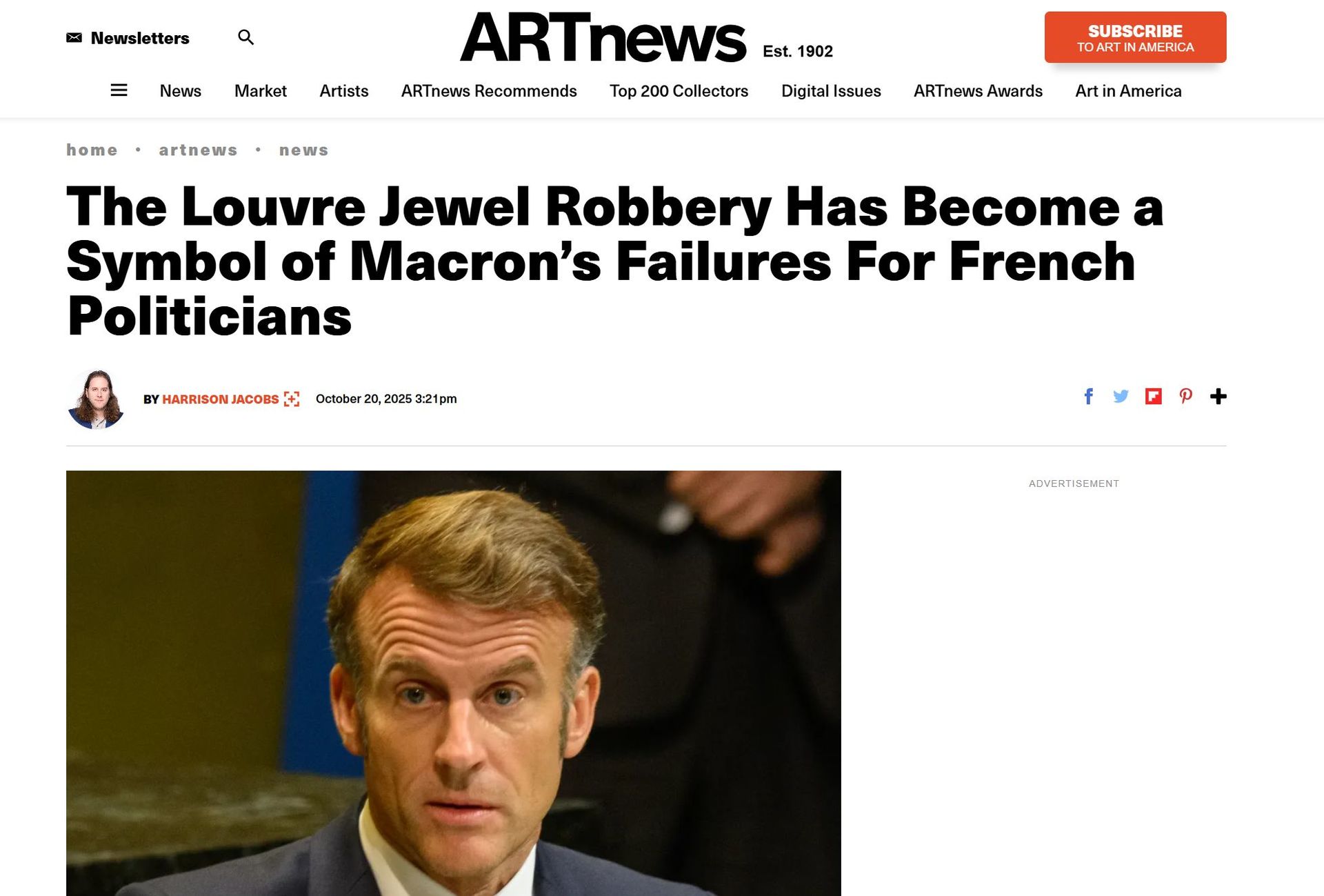 По мнению журналиста ARTnews, громкое преступление было совершено в «самое неудачное для Макрона время»: только что его правительство едва избежало вотума недоверия. Ограбление Лувра «подчёркивает глубокую нестабильность второго срока Макрона», утверждается в статье.